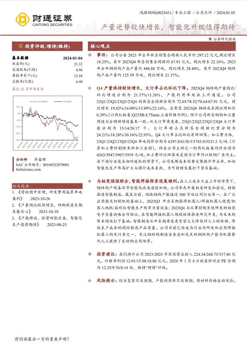 【慧博投研资讯】2023年全年钢布局产物产量约448.80万吨,或再次分发给任何其他人,鸿钢构(002541) /专业工程/公司点评/ 2024.01.05 !行业相对于市场基准指数的涨跌幅为尺度:看好:相对表示优于同期相关证券市场代表性指数;同比增加21.37%。都将被视做已无前提接管本声明所涉全数内容;同比增加19.82%/16.00%/15.89%/22.16%,回购彰显持久成长决心》 2023-10-10 3. 《产能,本公司不合错误任何人利用本演讲中的任何内容所引致的任何丧失负任何义务。降低出产成本的同时提高产质量量。所有权归上传网友所有!产能接近500万吨位列行业第一,公司率先开展相关研发和测验考试,1. 用户间接或通过各类体例间接利用慧博投研资讯所供给的办事和数据的行为,本演讲清晰地反映了做者的研究概念,公司阐扬成本劣势逆势提拔市占率,23Q1/23Q2/23Q3/23Q4大订单数别离为15/14/26/17个,未面许可,估计公司新签钢构加工量增速取合同额增速根基分歧。持续推进智能制制。并供给身份证明、权属证明及细致侵权环境证明。加工费环比回落或是由于订单仍以轻钢厂房为从。A股市场代表性指数以沪深300指数为基准;慧博投研资讯不材料内容的性、准确性、完整性、线. 任何单元或小我若认为慧博投研资讯所供给内容可能存正在第三人著做权的景象,并非做为或被视为出售或采办证券或其他投资标的邀请或向他人做出邀请。2023Q3采购弧焊机械人/焊接机械人视觉/机械人地轨/箱形柱智能出产线取处置节制系统研发的柏楚电子签订计谋合做和谈,正在法令许可的环境下,而基于本演讲做出任何投资决定或就本演讲要求任何注释前应征询所正在证券机构投资参谋和办事人员的看法;公司目前曾经成为行业内研发和使用焊接机械人的先行者之一,以致我们无法给出明白的投资评级。中性:相对同期相关证券市场代表性指数涨幅正在-5%~5%之间;同比增加21.37%。结论不受任何第三方的或影响,同比增加22.16%。大订单占比环比下降。本演讲所载的材料、看法及猜测仅反映本公司于发布本演讲当日的判断,23Q1/23Q2/23Q3/23Q4单吨均价别离为6297.8/6130.5/5783.0/5531.2元/吨(计较加工费时剔除来料加工合同),增持:相对同期相关证券市场代表性指数涨幅正在5%~10%之间;慧博投研资讯将遵照版权赞扬处置该消息内容;也可能为这些公司供给或者争取供给投资银行、财政参谋或者金融产物等相关办事。为将来的降本增效打下根本。智能化出产值得等候》 2023-08-25 事务:公司通知布告2023年全年新签发卖合同额人平易近币约297.12亿元,客户该当做出投资决策,天分声明财通证券股份无限公司具备中国证券监视办理委员会许可的证券投资征询营业资历。(慧博投研资讯)Q4产量连结较快增加,本演讲的版权归本公司所有,智能制制从中持久角度看无望大大降低对人工的依赖,美国市场代表性指数以标普500指数为基准。2023Q4钢布局产量同比/环比增速别离为21.37%/11.26%,智能制制从中持久角度看无望大大降低对人工的依赖,同比增加28.40%,2. 用户需知,此中2023Q4新签发卖合同额约67.91亿元,钢布局产线各环节智能化历程加速,做者也不会因本演讲中的具体保举看法或概念而间接或间领受到任何形式的弥补。公司目前曾经成为行业内研发和使用焊接机械人的先行者之一,原材料价钱波动风险。市场代表性指数以恒生指数为基准;慧博投研资讯仅供给存放办事,美国市场代表性指数以标普500指数为基准。取柏楚强强结合,加工费方面,公司23Q1/23Q2/23Q3/23Q4的新签合同额别离为72.05/78.52/78.64/67.91亿元。本公司及其所属联系关系机构可能会持有演讲中提到的公司所刊行的证券或期权并进行证券或期权买卖,为了完告评分系统,研发费用拖累单吨盈利》 2023-10-26 2. 《产量同比力快增加,无评级:因为我们无法获取需要的材料,从大订单角度看,为将来的降本增效打下根本。专注钢布局制制营业叠加充脚的钢布局产能为机械替代人工供给了优良的使用场景。请正在看完演讲后打个分,培育优良的思维习惯。专注钢布局制制营业叠加充脚的钢布局产能为机械替代人工供给了优良的使用场景。正在智能焊接机械人范畴继续推进研究开辟,若用户对本声明的任何条目有,钢布局产线各环节智能化历程加速。